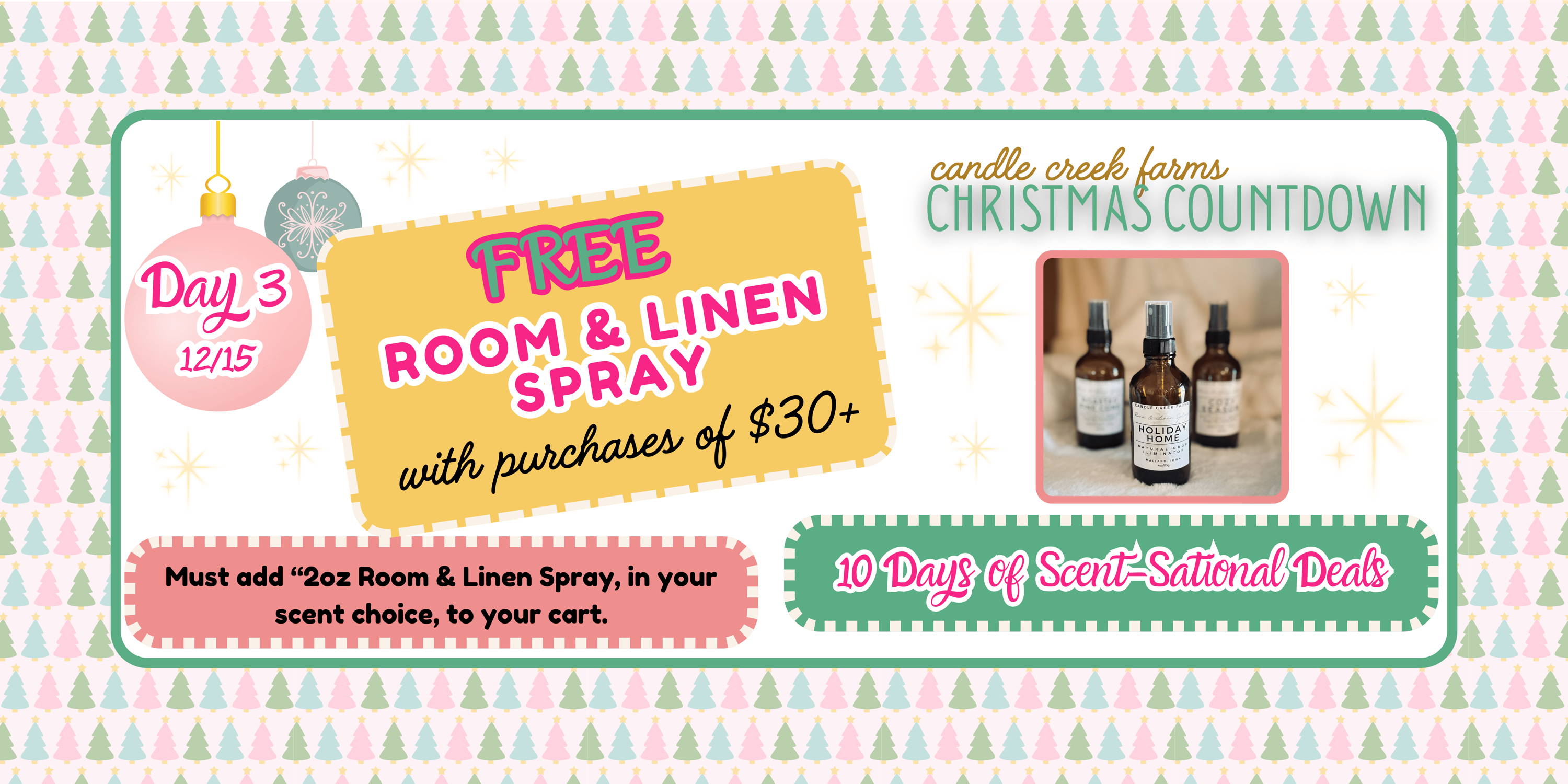 Because every cozy space deserves a little extra. Spend $30+ and receive a FREE 2oz Room & Linen Spray - perfect for freshening bedrooms, bathrooms, or gifting alongside your favorite candle.