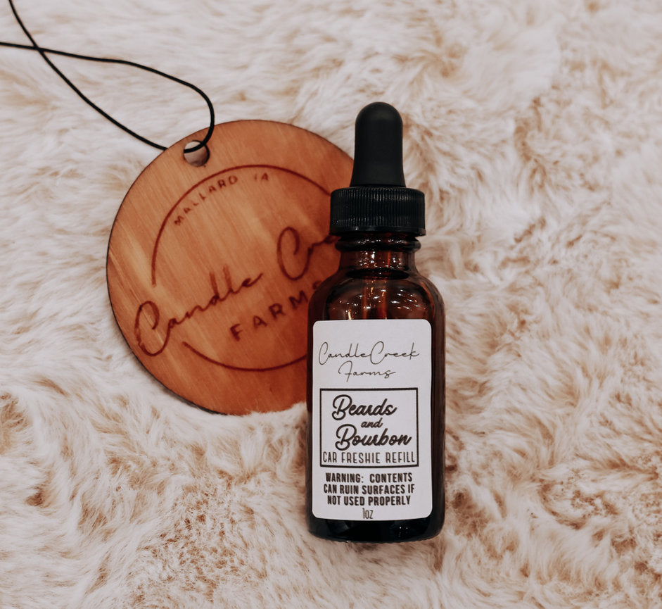 These easy-to-use kits allow you to have your favorite scent on the go! Available in the Ever Collection scents (except Iowa.) The Car Freshie Kit includes a pre-scented puck and a 1oz dropper bottle filled with your favorite scent. Directions are simple. Hang your wooden puck from your shifter, rear-view mirror, or wherever you choose in your car. When you would like to add more scent, place your wood puck onto a paper towel. Place 5-6 drops of oil on each side. Let it dry and hang it back up! The oil could take finishes off of surfaces if spilled or splashed on. Candle Creek Farms is not responsible for any damage from spillage.